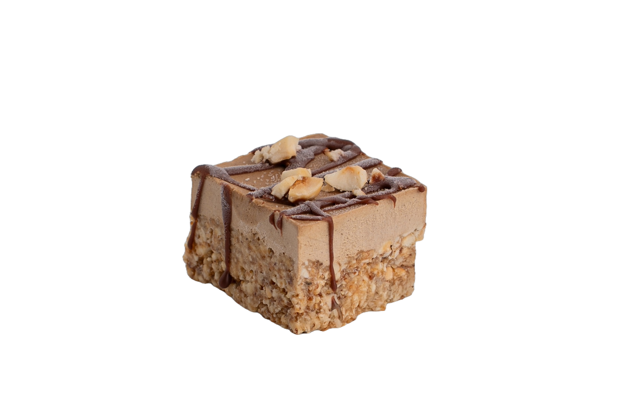 Den perfekta mumsbiten för hasselnötälskare, sammansatt av 3 konsistenser, den knapriga basen, hasselnötskräm och chokladtäcket. Hasselnötter och cashewnötter utgör basen i desserten tillsammans med en söt hasselnötskräm som sedan fulländas av ett sista lager mörk choklad.
